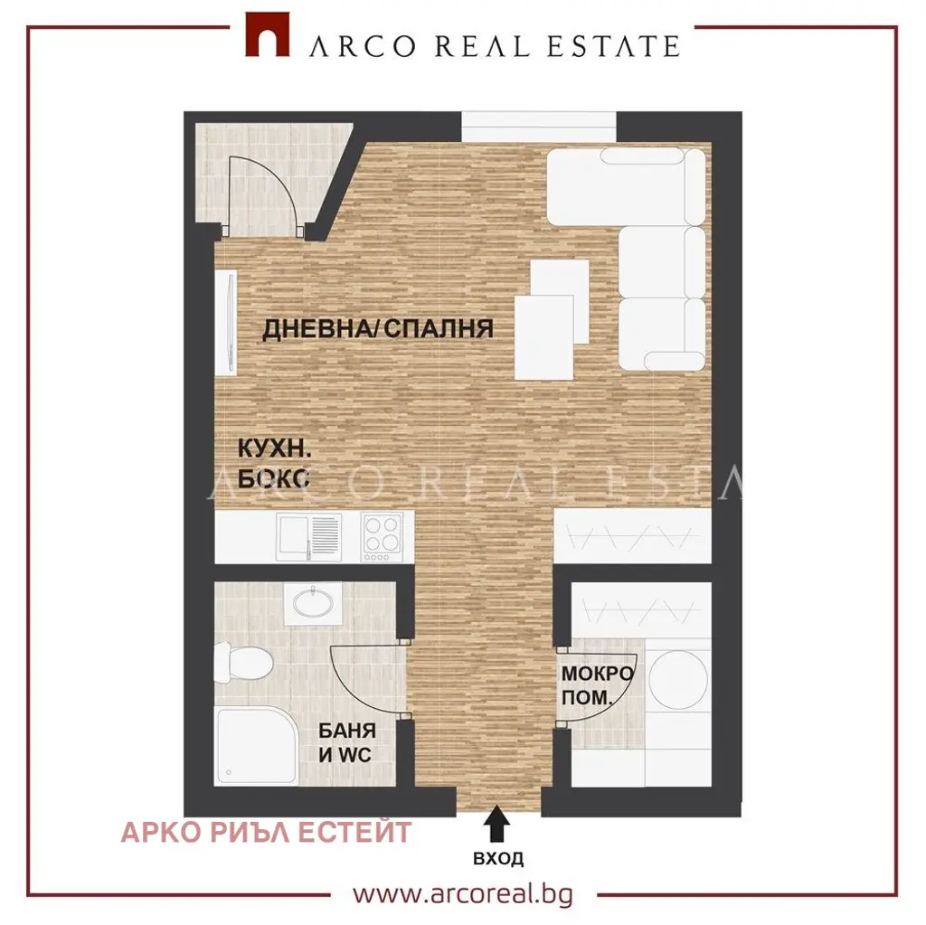 Разпределение: входно антре с мокро помещение, дневна с кухненски кът, баня с тоалетна и тераса.