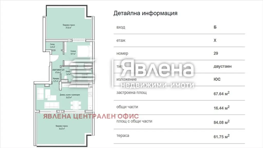 Апартаментът е с площ от 67,64кв.м. (84,08кв.м. с о.ч.) и се намира на ет.10, кота +27,10м. с южно и северно изложение, като към него има допълнително прилежащи 2 покривни тераси с площ от 34кв.м. и 27,5кв.м.