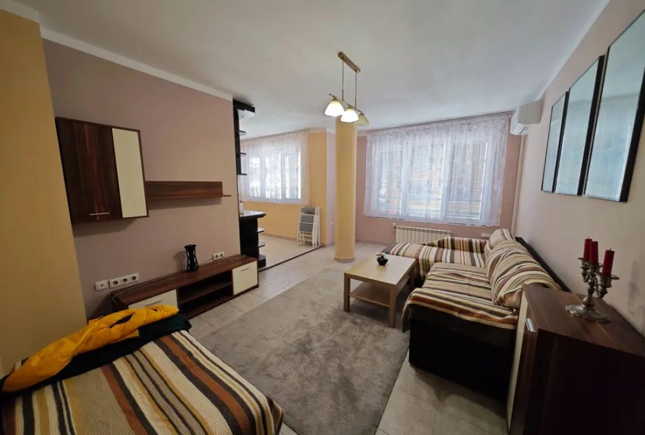 Парко място в закрит паркинг. Обзаведен. Две стаи един санитарен възел, дневна с кухненски бокс.