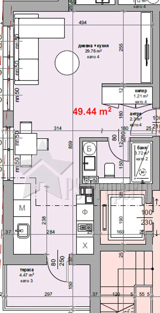 Характеристики: Имота се състои от входно антре, голяма дневна 30 кв.м., включваща кухненски бокс, кът за хранене и спален кът, баня с тоалетна, мокро помещение и тераса. Имота е изключително подходящ за живеене или инвестиция!!!
