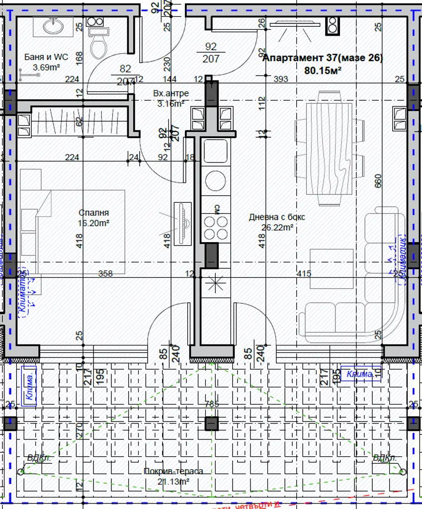 ДВУСТАЕН апартамент с площ от 100 кв. метра. Състои се от антре, всекидневна с кухненски бокс,спалня,баня с тоалетна и тераса. С изцяло източно изложение, среден апартамент. ДВУСТАЙНИЯТ апартамент ще бъде издаден в следния вид: стени и тавани шпакловка, под замазка, тераси гранитогрес, ел. инсталация до фасунга и ключ, ПВЦ дограма. Възможност за закупуване на гараж.