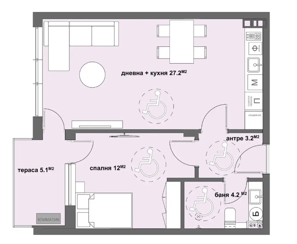Характеристики: Представяме на вашето внимание новострояща се сграда с АКТ-14 от утвърден строител. Двустаен апартамент разположен на втори етаж в сграда с асансьор. Отлични разпределения, предоставящи функционалност и рационално усвояване на пространствата, и светла височина на етажите 2,60м, благоприятни изложения. Имотът се състои от просторно входно антре, просторна слънчева всекидневна с кухненски бокс, спалня, баня с тоалетна и тераса.
