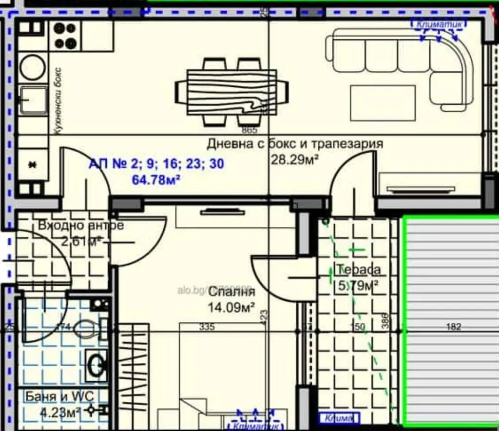 Апартаментът се състои от всекидневна + кухненски бокс, една спалня, входно антре, баня с тоалетна, тераса.