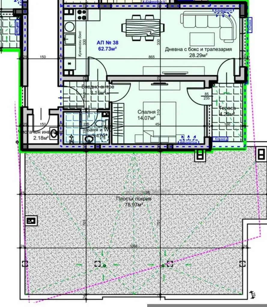 Апартаментът се състои от всекидневна + кухненски бокс, една спалня, входно антре, баня с тоалетна, тераса.