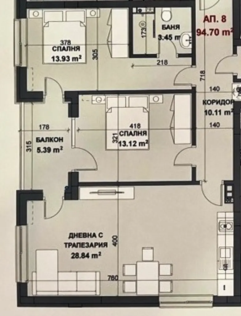 Просторна всекидневна с кухненски бокс; Две спални; Дрешник и баня с тоалетна.