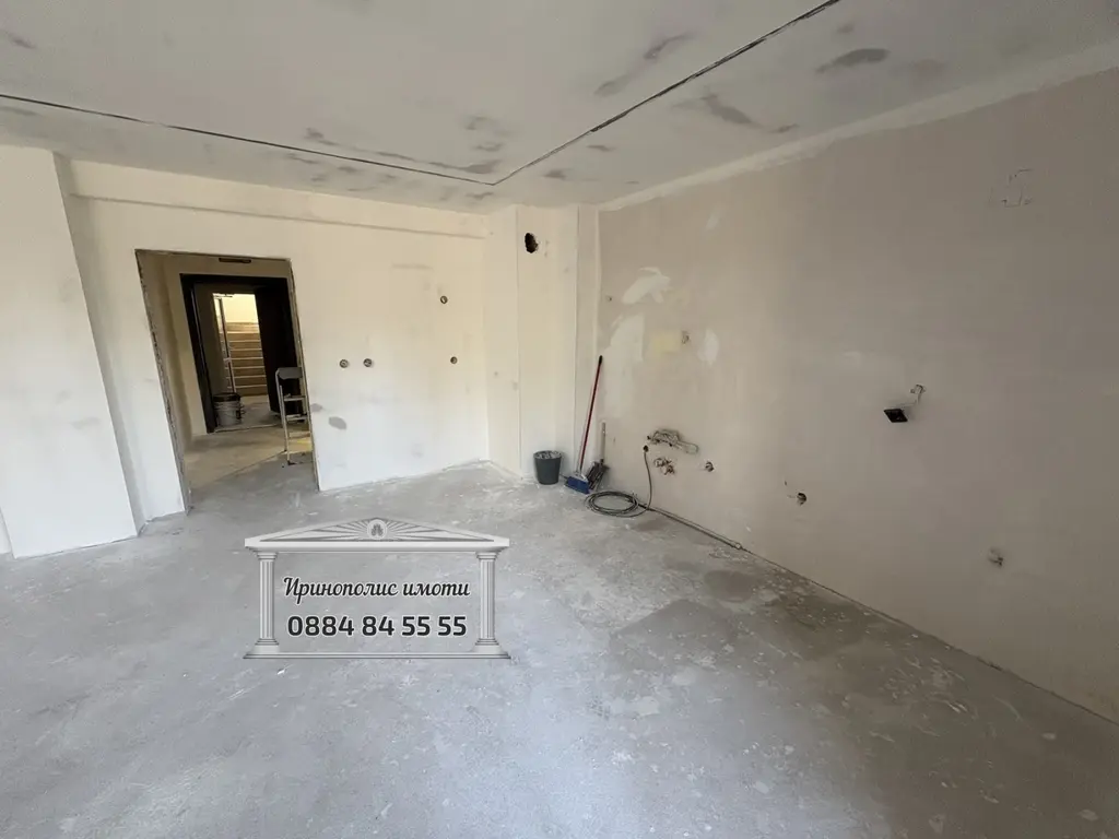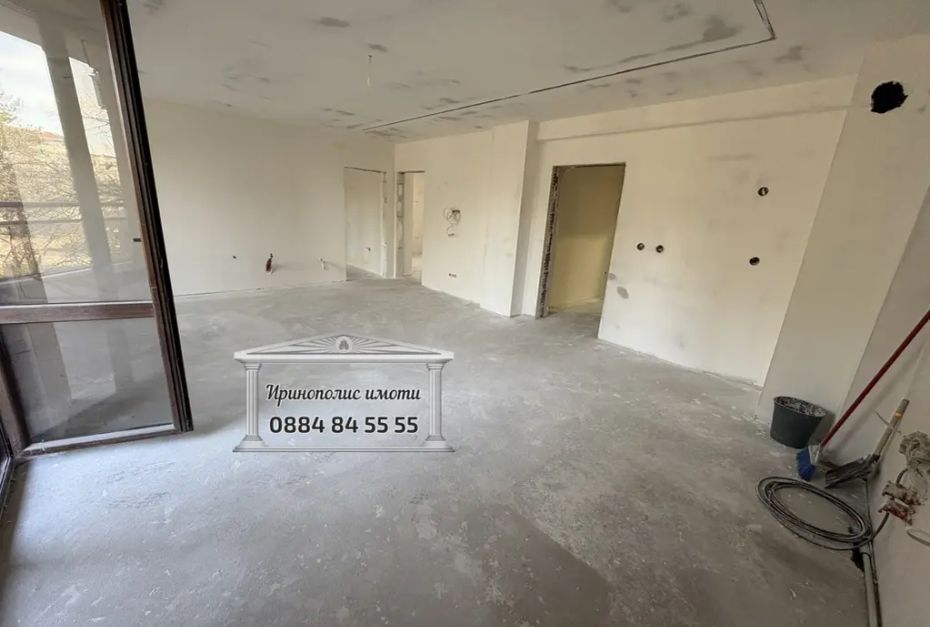 Апартамента е подготвен за боядисване, на финна шпакловка, изведена топла вода до всекидневната, с подово отопление и термопомпа. Банята е изцяло завършена.Изготвени са проекти за всекидневната с кухненската част и за едната спалня.