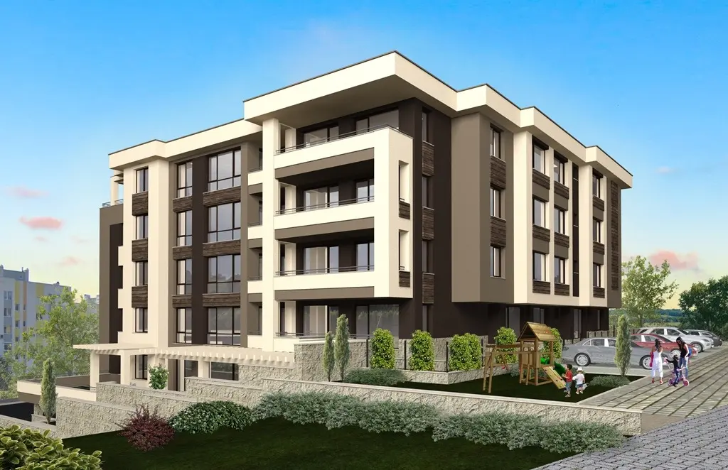 Състои се от антре, всекидневна с кухненски бокс, две спални, баня и тоалетна и балкон, с изложение юг/ запад. ТРИСТАЙНИЯТ апартамент ще бъде издаден в следния вид: стени и тавани шпакловка, под замазка, тераси гранитогрес, ел. инсталация до фасунга и ключ, ПВЦ дограма. Възможност за закупуване на гараж.
