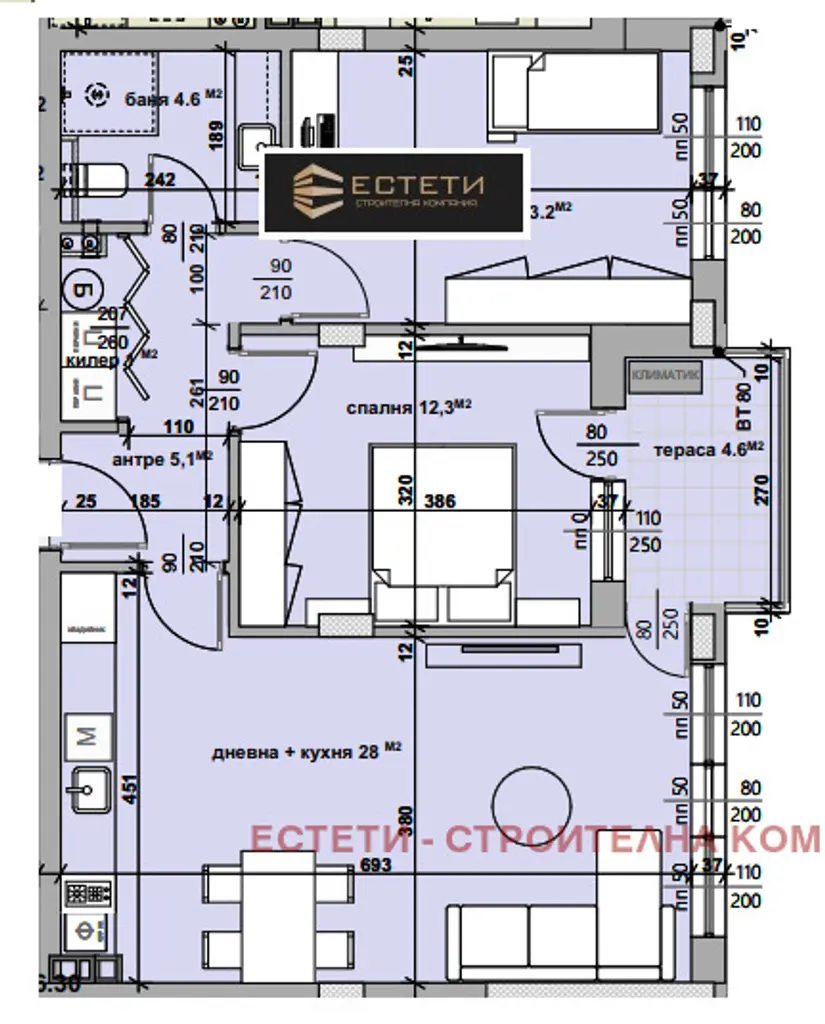 🏠 Тристаен апартамент, състоящ се от: антре, дневна с кухня, 2 спални, баня с тоалетна, килер, тераса . Квадратура: - 94кв.м.