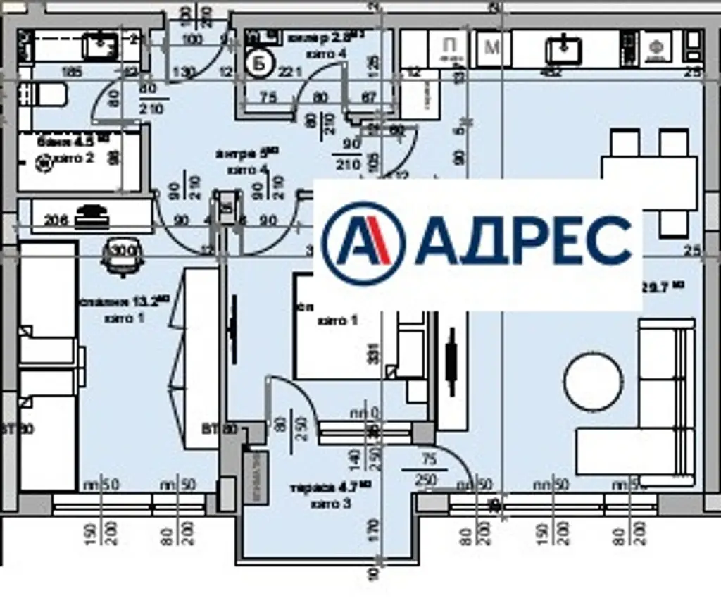 ТРИСТАЙНИЯТ апартамент е с площ от 102,12 кв. м. Състои се от всекидневна с кухненски бокс, две самостоятелни спални, балкон, баня с тоалетна и килер. ТРИСТАЙНИЯТ апартамент ще бъде издаден в следния вид: стени и тавани шпакловка, под замазка, ВиК до тапа, Ел. инсталация, ПВЦ дограма френски прозорци с максимален достъп на светлина, поръчкови врати.
