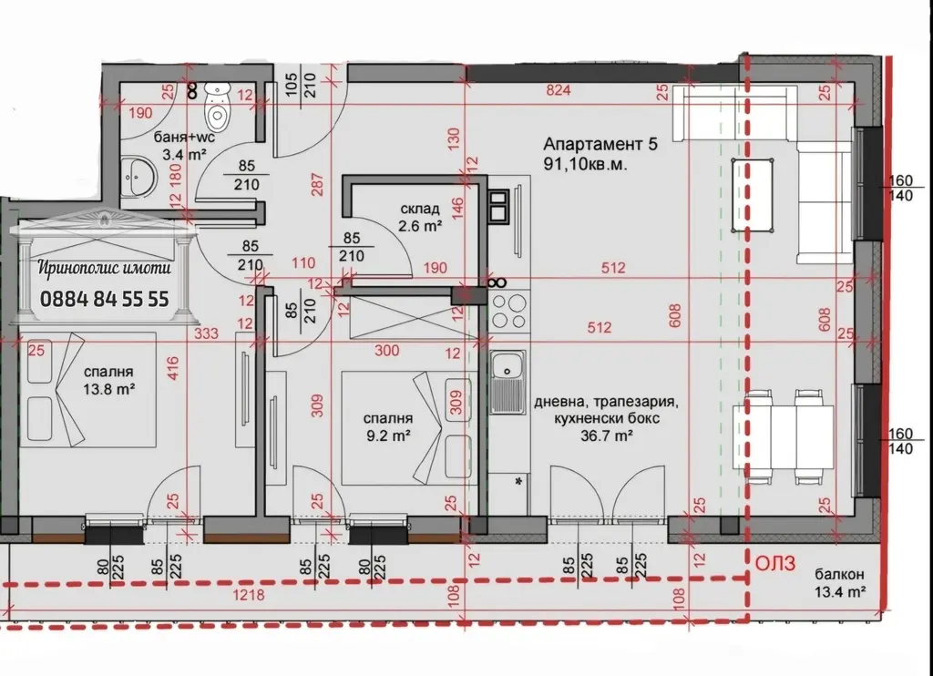 В настоящата обява представяме ТРИСТАЕН апартамент, състоящ се от входно антре, голяма и просторна всекидневна + кухненски бокс, две спални, баня с тоалетна, сервизно помещение и просторна тераса.