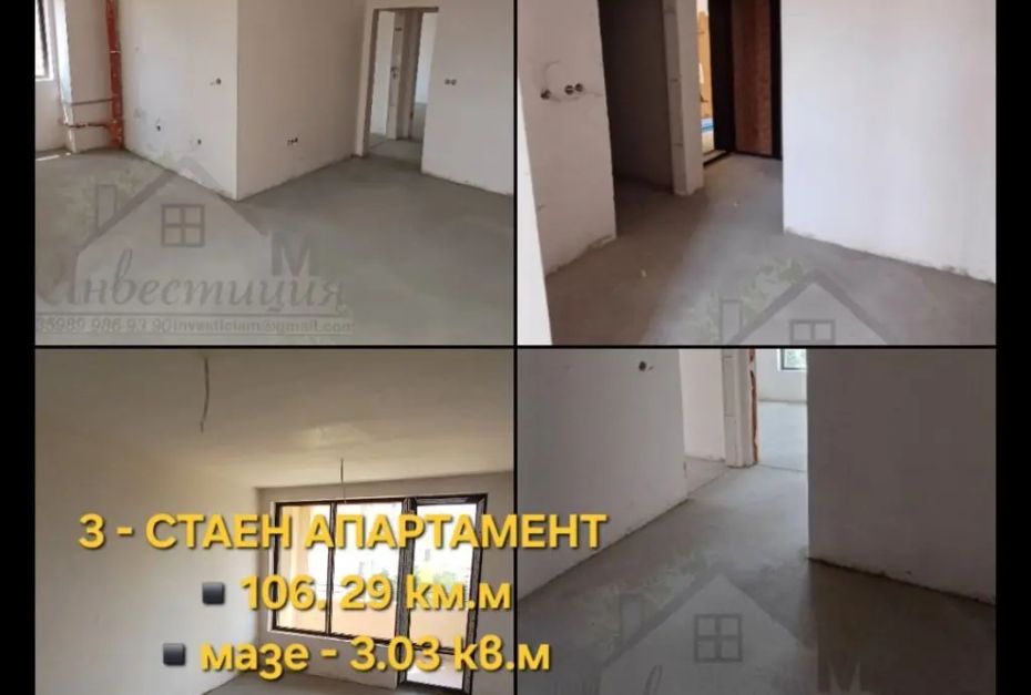 Апартаментът се състои от: просторно входно антре в което можете да разположите шкаф за обувки, закачалка за дрехи, дрешник или вграден гардероб, място за сядане, огледало и др. Продължаваме с просторна всекидневна с кухненски кът с тераса 6 кв.м. Две спални- едната родителска и детска стая, баня с тоалетна. Жилището е просторно с максимално функционално разпределение за семейно жилище. Площта на апартамента е 106,26 кв.м и към него има Мазе от 3.03 кв.м., прехвърля се и земя върху която е построена сградата от 26,73 кв.м. Изложението на имота е С/З/Юг.