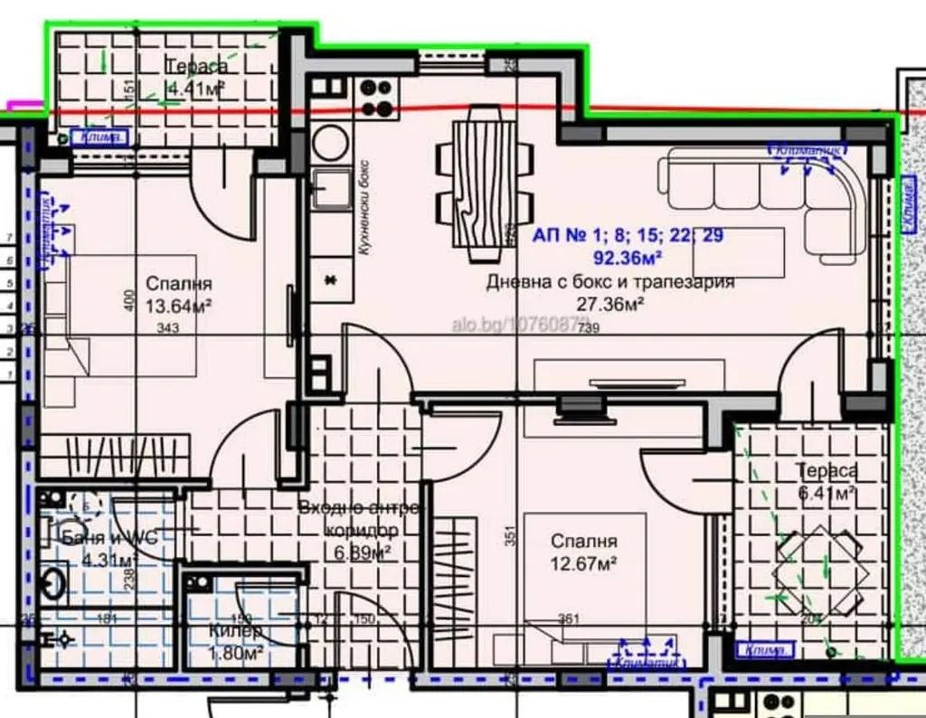 Апартаментът се състои от всекидневна + кухненски бокс, две спални, входно антре, баня с тоалетна, две тераси, килер.