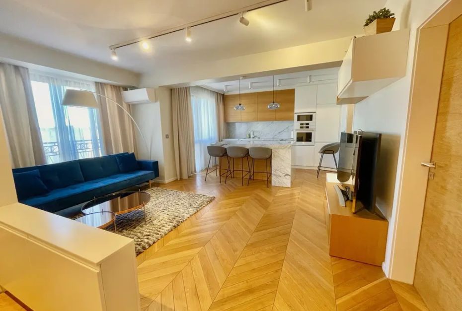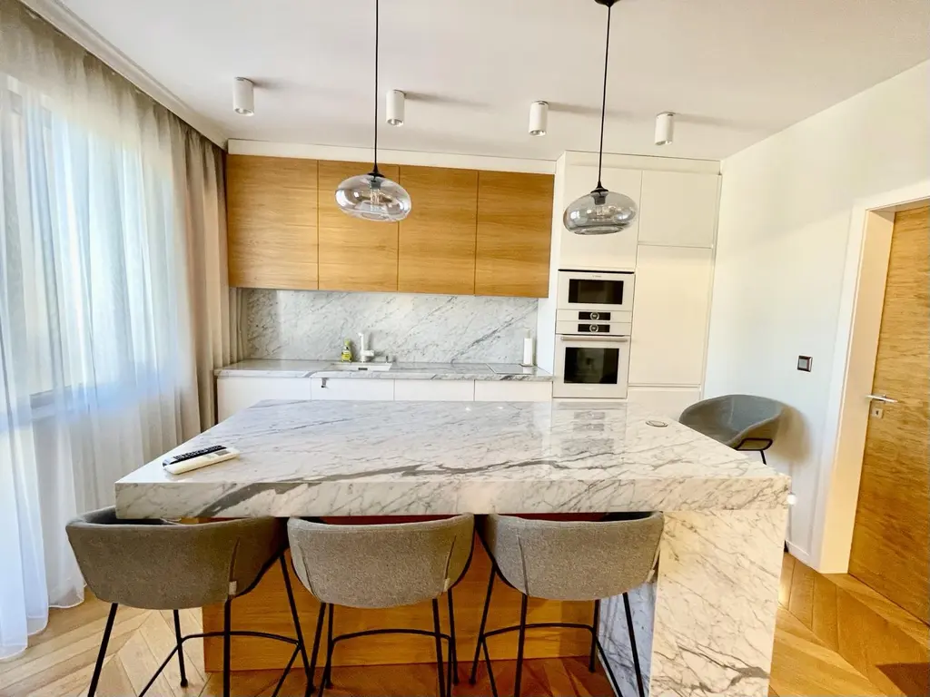 Жилището е с площ от 100 кв. метра и се намира в нова сграда в центъра на града. Подава се във вида от снимките, с елегантно обзавеждане и поръчково оборудване. Възможност за гараж!