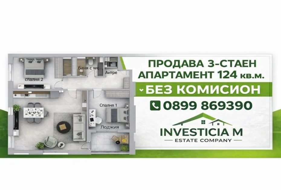 Агенция Инвестиция М, продава БЕЗ КОМИСИОН, ново строителство, тристаен апартамент от 123,55кв.м.,цена на строител. Искаме да Ви предложим едно семейно жилище с две спални и просторна всекидневна.