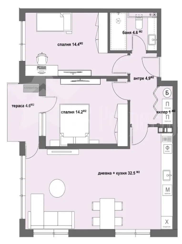 Разпределение: антре, просторна всекиднвна, две спални, килер, тераса и баня с тоалетна.