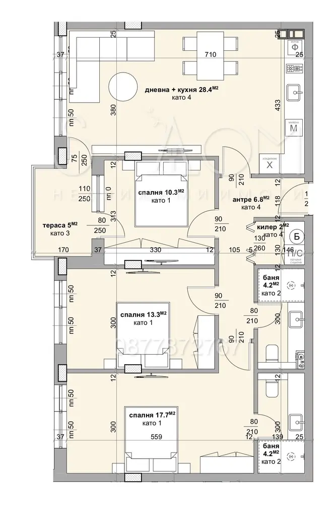 Предлага се за продажба апартамент със следното разпределение => всекидневна с кухненски бокс, три самостоятелни спални, като едната разполага със собствена баня с тоалетна, втора баня с тоалетна, обслужваща останалите помещения, склад, тераса, коридор.