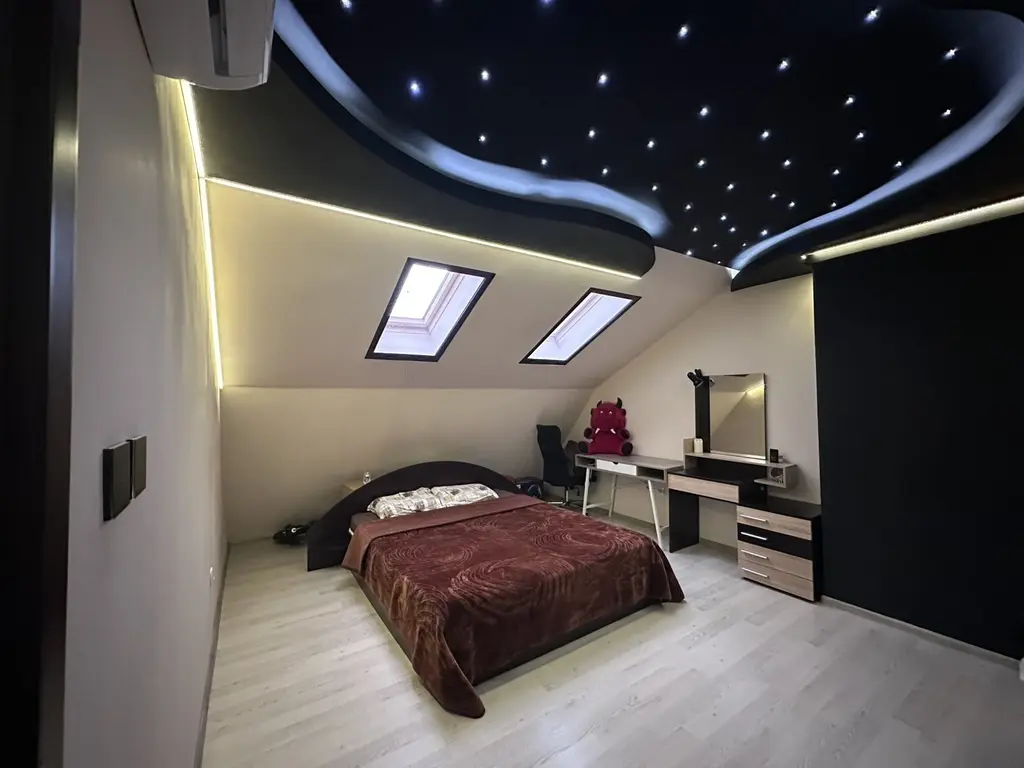 Характеристики: Имота се състои от входно антре, просторна всекидневна с излас на тераса, мансарна спални, втора спалня преустроена в дрешник, санитарен възел и таван. Обзаведен и оборудван с всички необходими електро уреди!!!