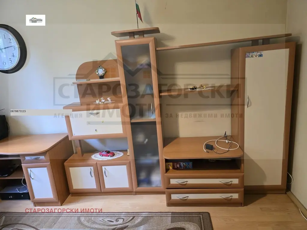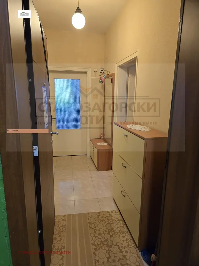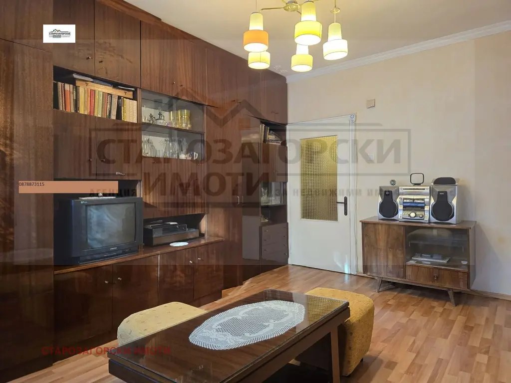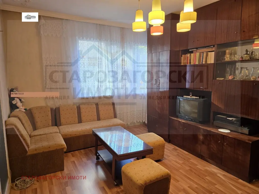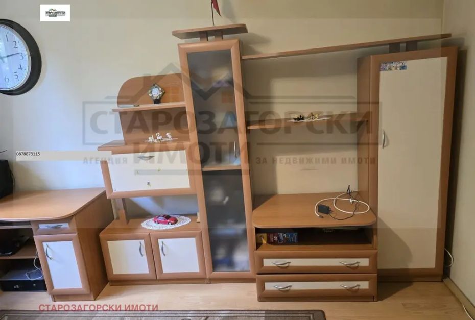 Старозагорски имоти продава апартамент състоящ се от всекидневна, кухненски бокс, две спални, баня с тоалетна с чиста застроена площ от 101.32 м2, ведно с таванско помемещение и мазе с метални врати. Жилището се намира в 4-етажна сграда, с чисти и поддържани общи части, в район с ниско строителство, с много зелени площи, детска площадка и игрище, в близост до две детски градини и училища, НАП и под парк Аязмото. Апартаментът е с вътрешна и външна изолация, с нова PVC и алуминиева дограма, блиндирана врата, с две тераси - едната, от които е с остъкление. Нова ел. част и ВИК. Топла вода се осигурява от два електрически бойлера (единия е кухненски) и един проточен газов бойлер. Отоплението и охлаждането се осигурява от два климатика - единият, от които е в гаранция. Жилището се продава с цялото налично обзавеждане и техника. Всички ел. уреди са изправни и не е необходима неотложна първоначална инвестиция при нанасяне. При интерес посочете код: 7297
