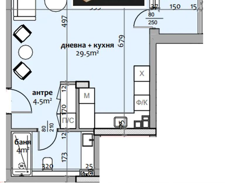🏠 Едностаен апартамент,тип студио, състоящ се от: антре, дневна с кухня, баня с тоалетна, тераса. Квадратура - 64,15 кв.м.