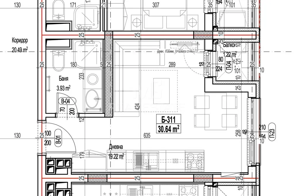 Обща площ: 37.32кв.м.; Чиста площ: 30.64кв.м.; Идеални части: 6.68кв.м.; Мазе: 3.35кв.м.