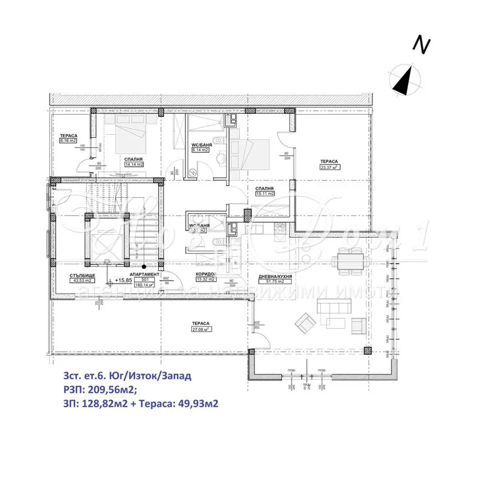 Апартамента представлява: входно антре с ниша за портманто, коридор със складово помещение/мокро, две бани с тоалетни, всекидневна 52м2 с излаз на банкетна тераса близо 30м2, спалня малко над 15м2 с излаз на втора тераса = 24м2, втора спалня 14м2 с тераса 6м2. Мезе в сутерена = 10м2