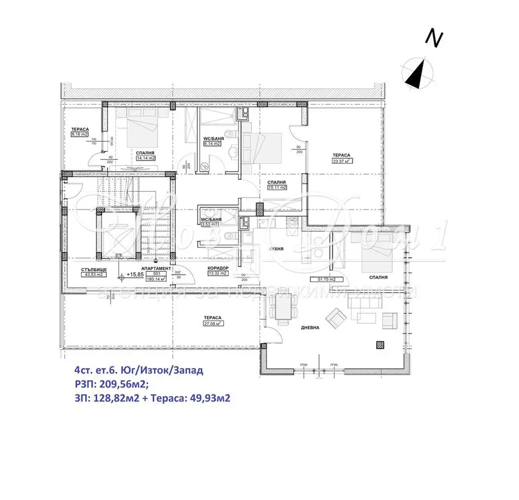 Апартамента представлява: входно антре с ниша за портманто, коридор със складово помещение/мокро, две бани с тоалетни, всекидневна 52м2 с излаз на банкетна тераса близо 30м2, спалня малко над 15м2 с излаз на втора тераса = 24м2, втора спалня 14м2 с тераса 6м2. Мезе в сутерена = 10м2