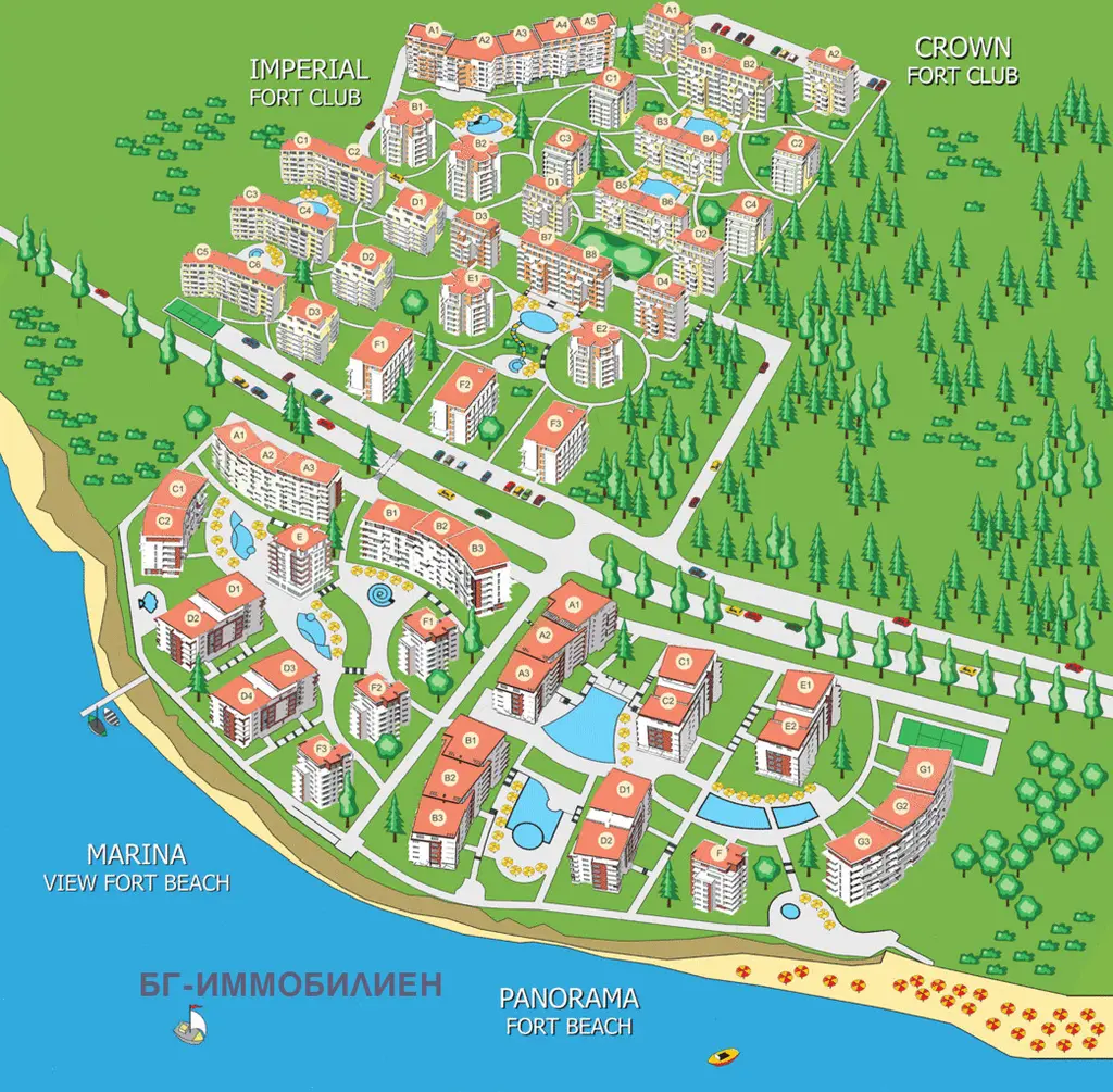 Гранд Ризорт се простира на огромна територия от над 100 000 кв.м. и е един най-големите жилищни комплекси на Черноморието. Жилището се намира в корпус G3 Панорама, една от сградите разположени най-близко до морето.
