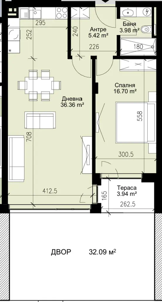 Разпределение: антре, дневна с кухня (36.36 кв.м), спалня (16.70 кв.м), баня, тераса и личен двор от 32.09 кв.м.