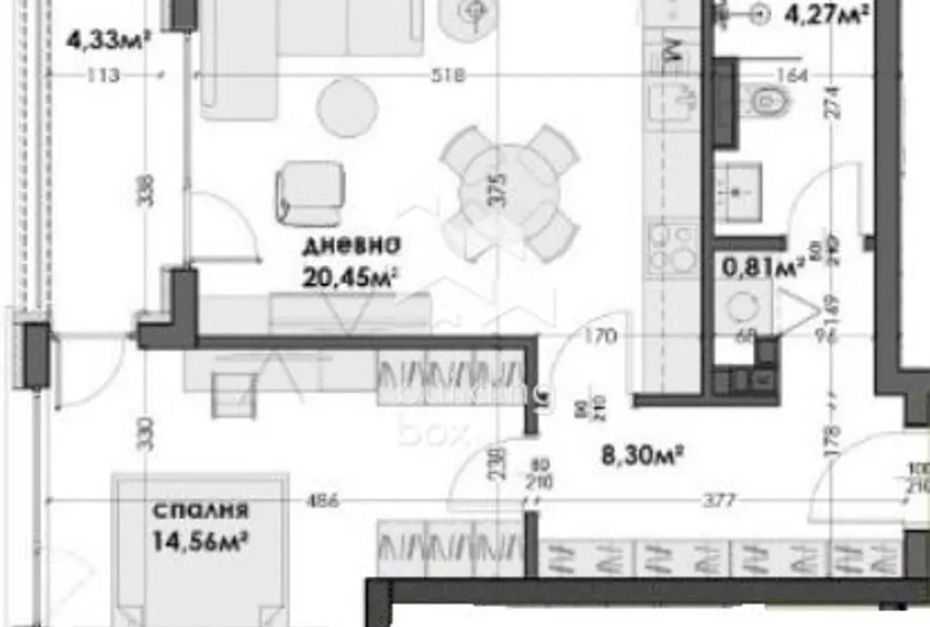РАЗПРЕДЕЛЕНИЕ: Всекидневна с кухненски бокс - 20.45 кв.м., спалня - 14.56 кв.м., баня с тоалетна с перално помещение, входно антре.