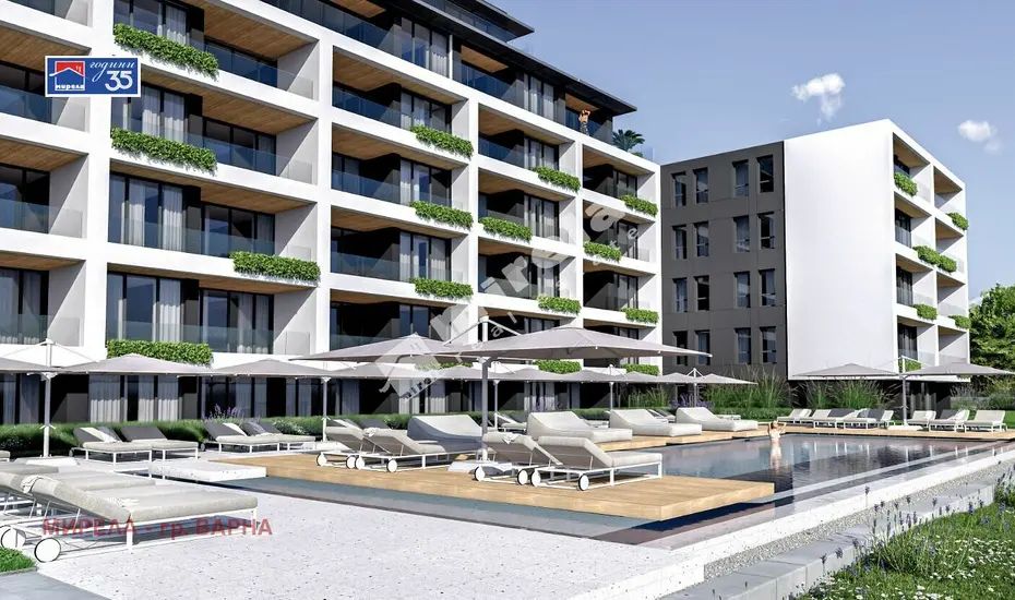 454012 Продаваме студия, двустайни, тристайни и четиристайни апартаменти в нов затворен комплекс с басейн на 2-ра линия над плаж Кабакум, в. з. Ален Мак, на 300 м от плажа - едно от най-търсените места за живеене и инвестиция в гр. Варна.