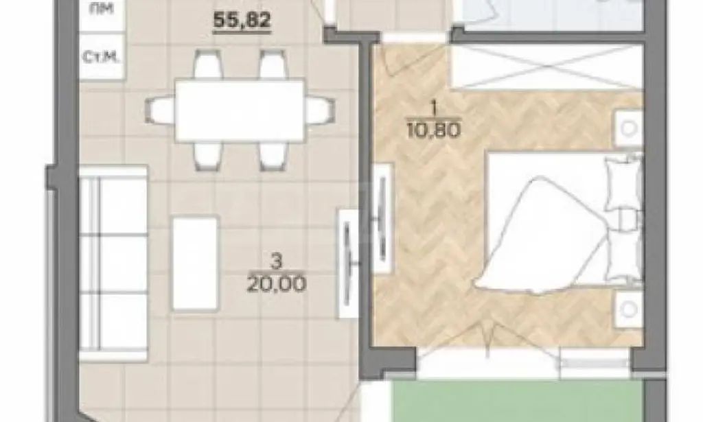 Жилището с обща площ от 55.82 кв.м е разположено на 1-ви етаж от 4 и има следното разпределение: