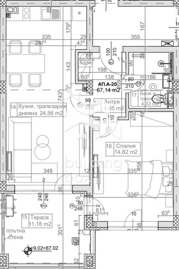 РАЗПРЕДЕЛЕНИЕ : Практично разпределен двустаен апартамент, който съчетава функционалност и съвременен стил. Състои се от просторна дневна с място за кухненски бокс и трапезария, спалня, баня с тоалет и тераса. Благодарение на големите прозорци, пространството е изпълнено с естествена светлина, което създава усещане за уют и откритост.