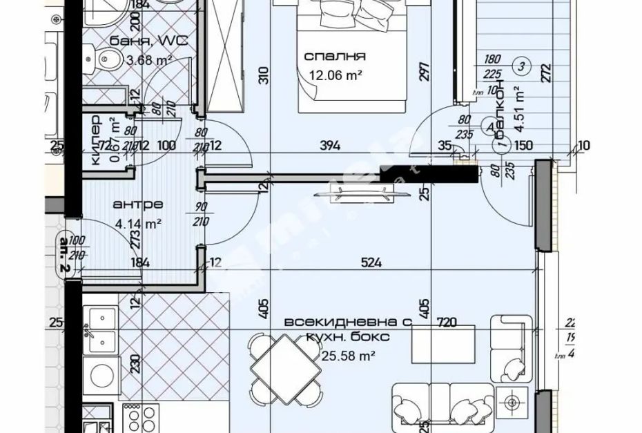 Жилището е средно, без отстъпи и скосове и с правилни форми на стаите.