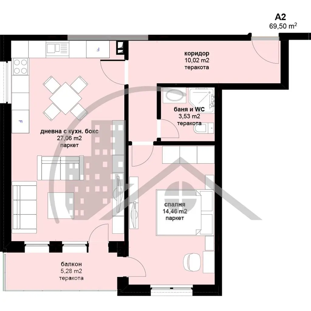 Жилището е разположено в чисто нова сграда с Акт16, на първи етаж над подземни гаражи и е с чиста площ 69.5 кв.м (85 кв.м с общите части). Състои се от просторен дневен тракт с трапезария, холова и кухненска част (27 кв.м), спалня (14.5), баня със санитарен възел и обща тераса за двете стаи. Изцяло южно изложение, статут - апартамент.