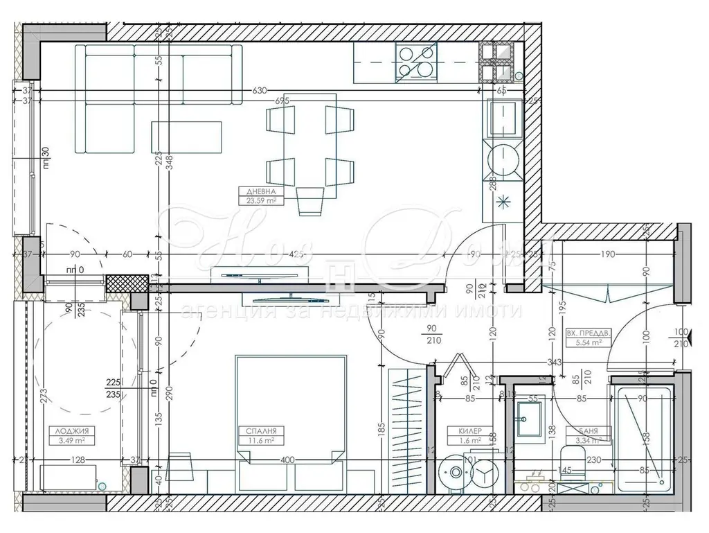 Просторна дневна с кухненски бокс и трапезария 23.59 кв.м;