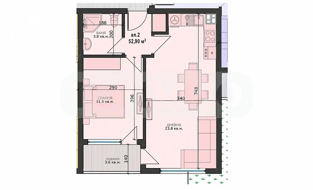 Разположен е на първи жилищен етаж и е със следното разпределение: антре, всекидневна с кухненска част, спалня, баня с тоалетна и лоджия.