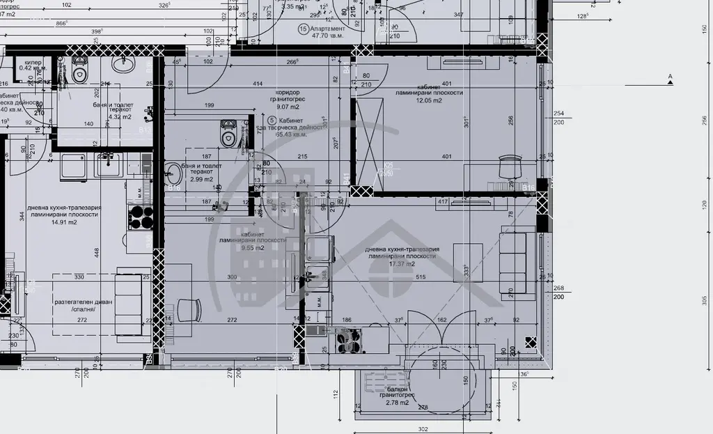 Жилището е разположено на трети етаж, изцяло покрито, с чиста площ 66 кв.м (73 кв.м с общите части) и се състои от входно антре, дневна-трапезария с кухненски ъгъл и излаз на тераса, две спални и баня със санитарен възел. Статутът на жилището е кабинет. Издава се по БДС - блиндирана входна врата, PVC - прозорци, стени на турбозолена финна мазилка, подове на замазка, ел. табло, инсталация, осветление на фасунга, инсталирани ел. ключове и контакти, изводи за климатици, ВиК на тапа. Просторни общи части, които ще бъдат завършени с качествен гранитогрес, парапети и асансьор Екстериора на сградата ще бъде стилно завършен в бели и меки пастелни тонове, с парапети от масивно ковано желязо, както и достатъчно зелена площ в двора на сградата. Налични паркоместа, както и други типове апартаменти.