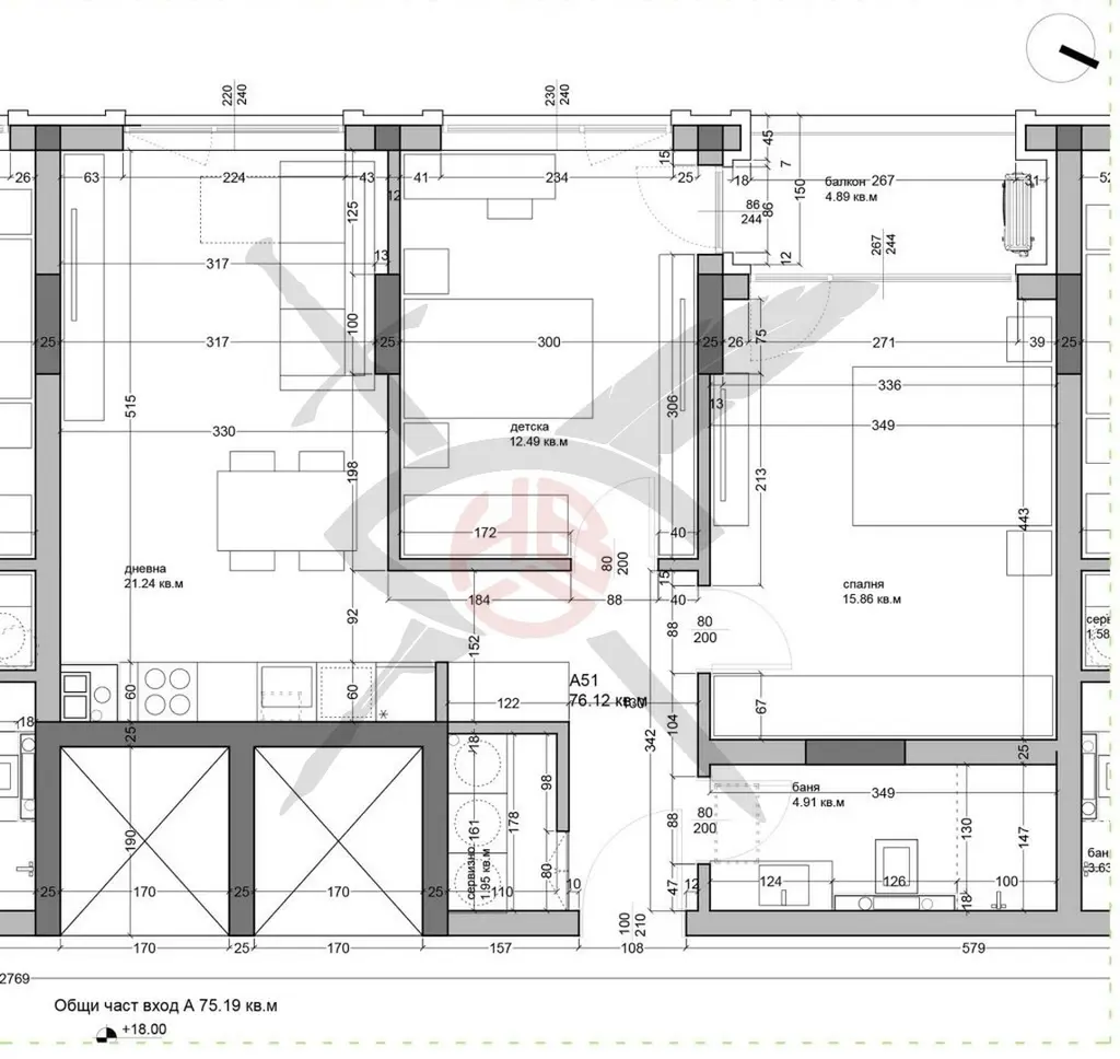 РАЗПРЕДЕЛЕНИЕ: Жилището разполага с площ от 89 кв.м., разпределена във входно антре, всекидневна с кухненска част, две спални, сервизно помещение, баня с тоалетна и тераса.
