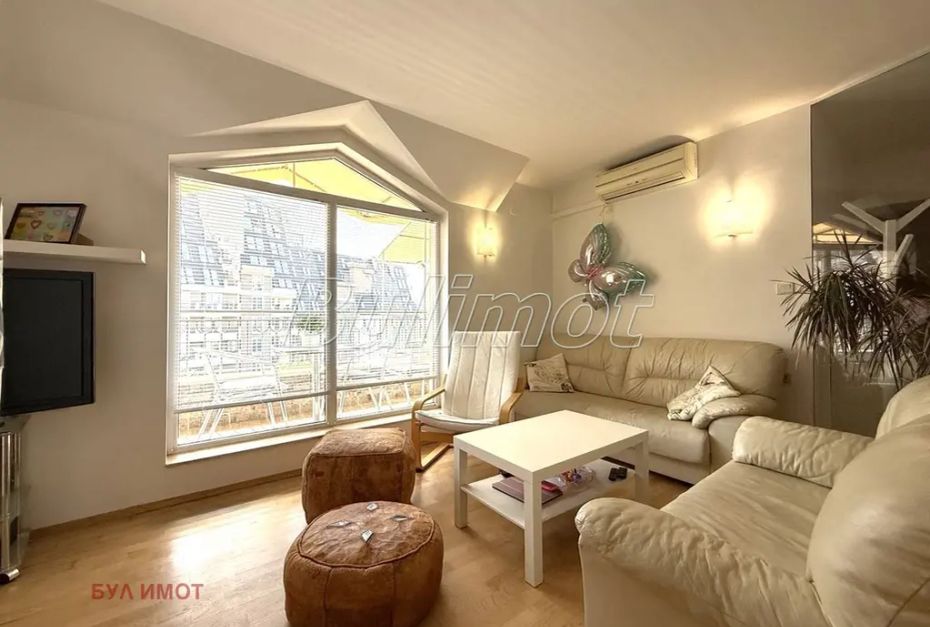 BUL IMOT ЭКСКЛЮЗИВНО ПРЕДЛАГАЕТ НА ПРОДАЖУ ПРЕКРАСНУЮ ТРЕХКОМНАТНУЮ КВАРТИРУ РЯДОМ С рынком ЧАЙКА. Квартира состоит из прихожей, солнечной гостиной с выходом на террасу, двух спален с выходом на террасу, ванной комнаты с туалетом и кладовой. В квартире имеется большое чердачное помещение, что является дополнительным преимуществом. Квартира продается с имеющейся мебелью и техникой. Для получения дополнительной информации и просмотра обращайтесь: Маринела Бахарева; номер предложения: 14324.