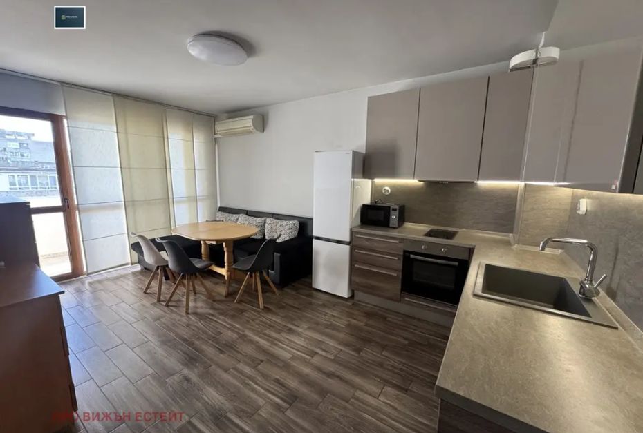 Апартаментът е разположен на шести етаж в сграда с асансьор и добре поддържани общи части. Състои се от входно антре, просторен дневен тракт с включена кухня и прилежаща прекрасна тераса с южно изложение, две самостоятелни спални и баня с тоалетна. Към имота има прилежащо избено помещение.