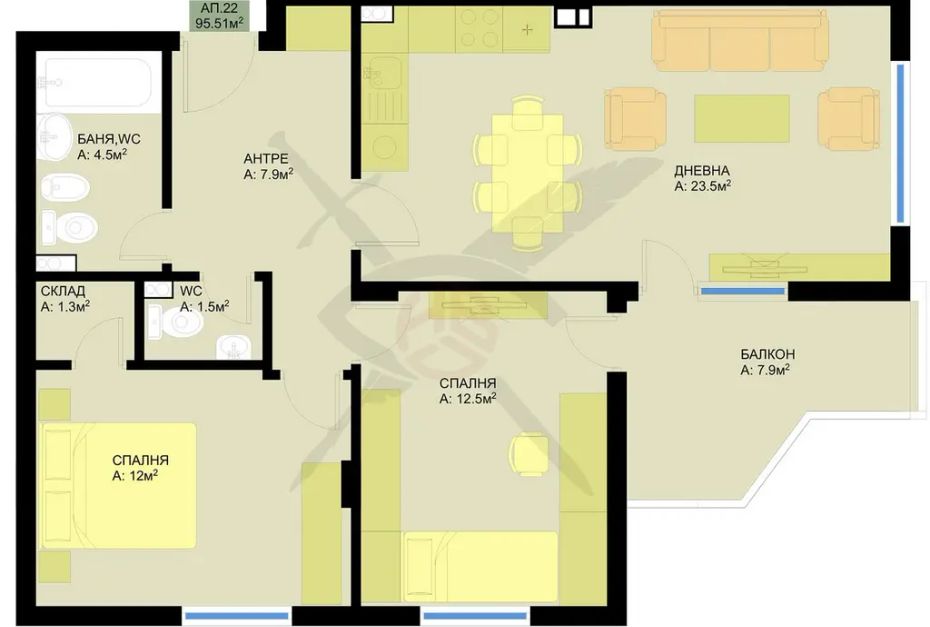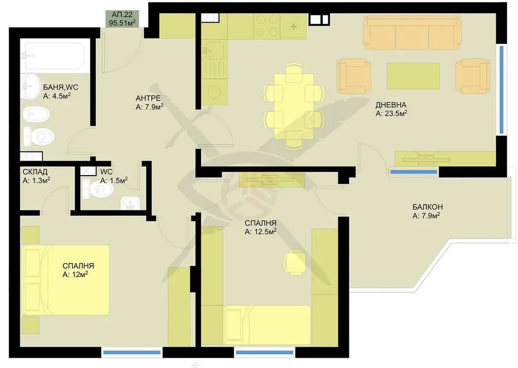 РАЗПРЕДЕЛЕНИЕ: Жилището разполага с площ от 96 кв.м., разпределена във входно антре, хол с кухненски бокс, две спални, баня с тоалетна, отделна тоалетна и два балкона.