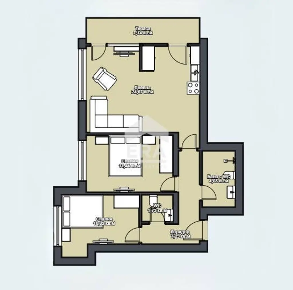 ЕРА Визия предлага за продажба тристаен апартамент със застроена площ 80,60 кв.м (95,56 кв.м с общите части), в новострояща се кооперация в начален етап, в кв. 'Изгрев', на 200 м от магазин Билла и на 150 м от спирка на градски транспорт. Имотът ще бъде разположен на 7 етаж от общо 10 и ще се състои от: коридор (7,29 кв.м), дневна с кухненски бокс и трапезария (24,07 кв.м), две спални (съответно по 11,44 кв.м и 10,02 кв.м), баня с тоалет (4,08 кв.м), отделен тоалет (1,73 кв.м), тераса с излаз от дневната (7,14 кв.м), ведно с прилежащо избено помещение (3,78 кв.м). Изложение: запад (двете спални и дневната) север (дневна). Ще се предлага необзаведен.