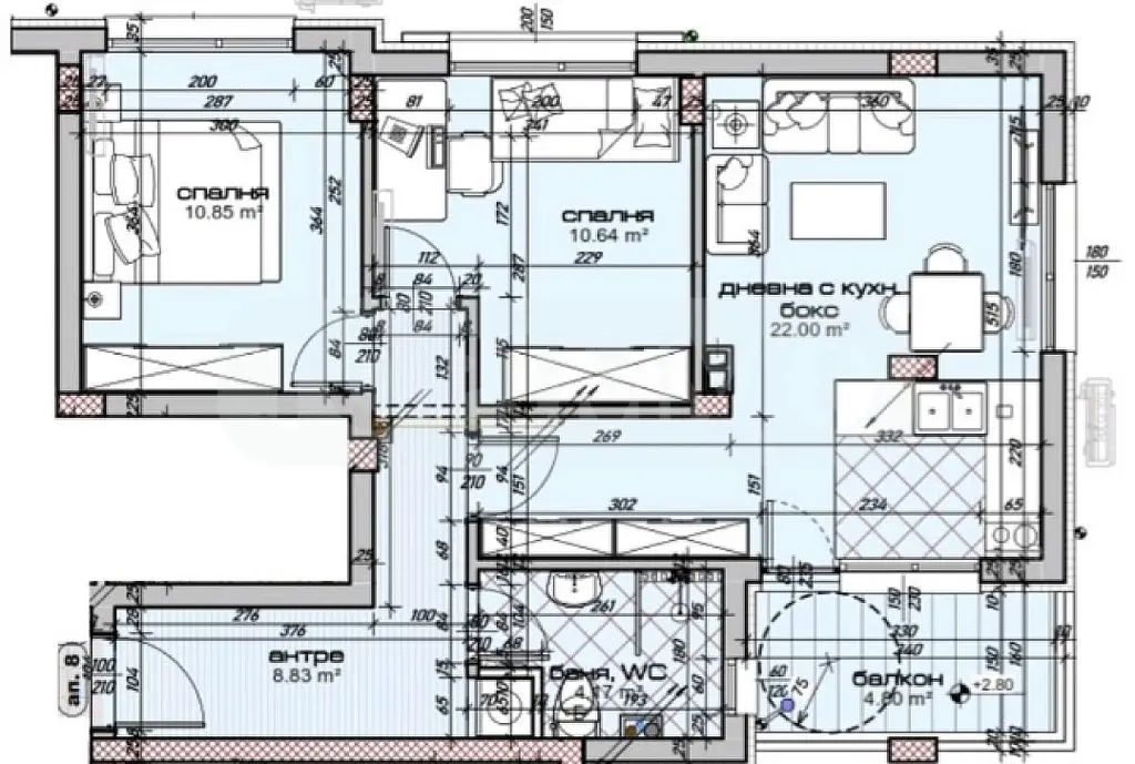Разположен на втори етаж с изложение юг/изток/запад, със следното разпределение: Г-образен коридор, всекидневна 22 кв.м. с излаз на балкон, две спални по 11 кв.м., санитарен възел и избено помещение.