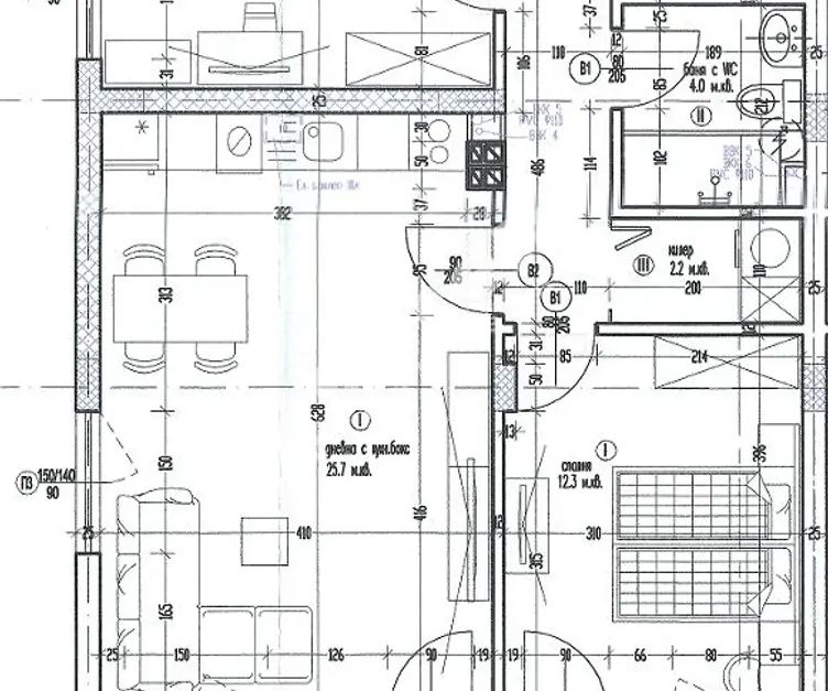 Дневен тракт с кухненски кът, зона за хранене и почивка- 25.70 кв. м.