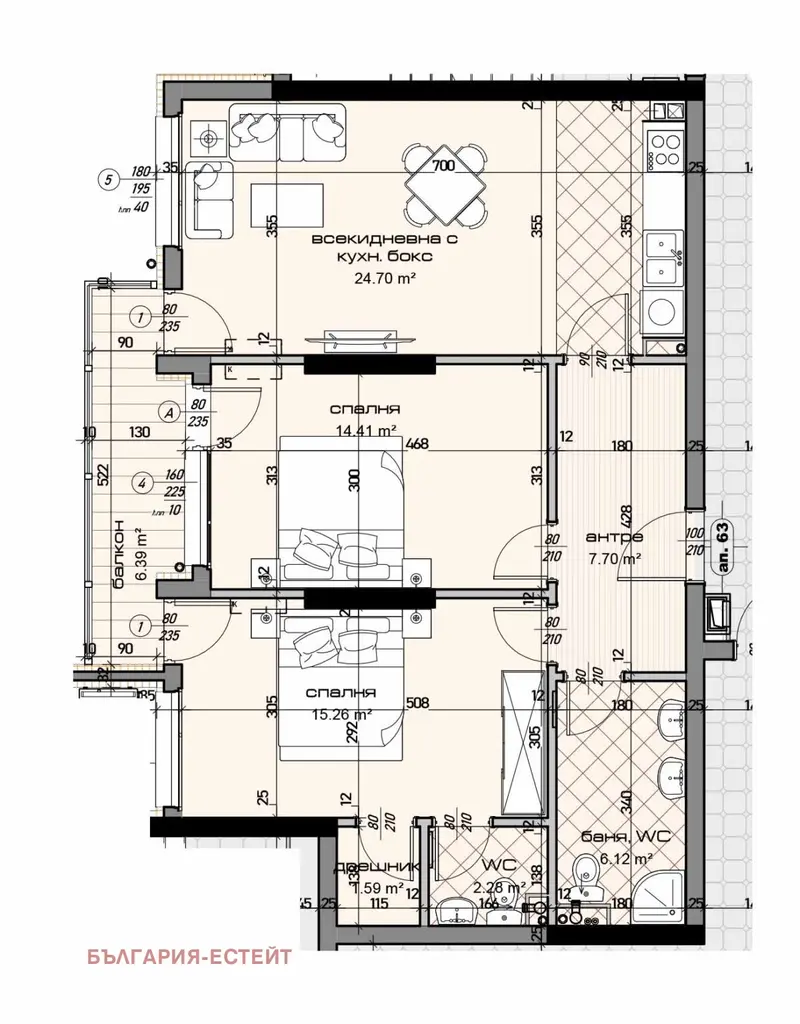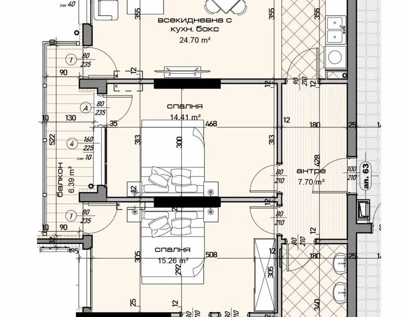 Тристаен апартамент състоящ се от дневна с кухненски бокс -24.70 кв.м, спалня 1 -14.41 кв.м ,спалня 2-15.26, баня с WC ,втора WC ,дрешник.И трите стаи излизат на един балкон.