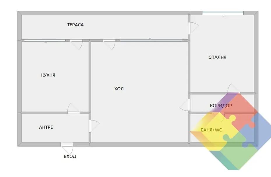 Жилището разполага с входно антре, просторна дневна, отделна кухня, спалня, баня с тоалетна и тераса. Разпределението позволява лесно преустройство и обособяване на втора спалня. Към имота има избено помещение.