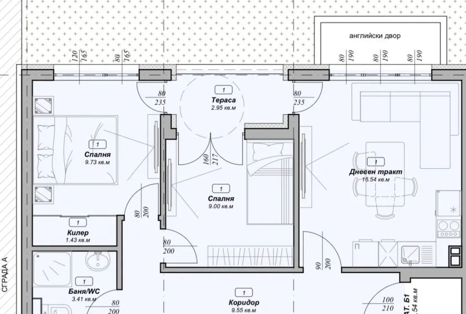 В изпълнението са заложени две тела, в които ще бъдат разположени 28 двустайни и 12 тристайни апартамента . Предвидени са 44 открити паркоместа, от които 4 за хора в неравностойно положение в непосредствена близост до входа. Апартаментите се издават в степен на завършеност по БДС. Балконите ще бъдат изпълнени с обмазна хидроизолация и замазка с наклон и настилка от мразоустойчив гранитогрес. ВиК инсталация: Водопровод - изпълнен с полипропиленови тръби с PN 16 и PN 20 за студена и топла вода - до тапа, монтирани водомери с опция за монтаж на модул за дистанционно отчитане. Канализация - изпълнена с РVС тръби, до тапи. И вентилация в мокрите помещения, изпълнена от PVC тръби с отвеждане над покрива, изпълнено ел. захранване, без монтирани вентилатори. Кухни / кухненски боксове изпълнена с готови двойни сифонни коминни тела. Индивидуално включване се осъществява към малкия отвор на коминното тяло. Отворите за аспирация се правят при монтаж на кухненското оборудване от клиента в зависимост от вида и височината на отвеждащия тръбопровод.