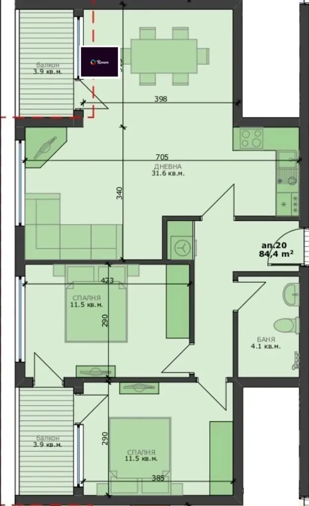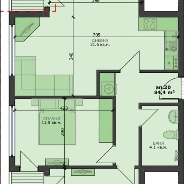 Апартаментът ще се състои от просторна дневна с кухнески бокс (31.6кв.м.), първа спалня (11.5кв.м.), втора спалня (11.5кв.м.), баня с тоалетна (4.1кв.м.), балкон (3.9кв.м.) и втори балкон (3.9кв.м.).