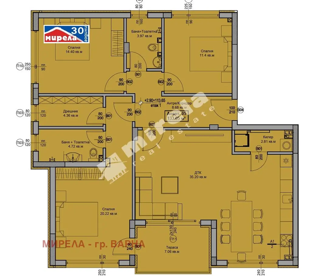 Разпределение: дневен тракт с кухненски бокс и тераса, родителска спалня с дрешник и собствена баня, две спални, втора баня и коридор.