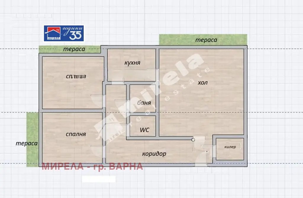 РАЗПРЕДЕЛЕНИЕ: антре, просторен хол, отделна кухня, две самостоятелни спални, баня и отделна тоалетна, килер и широк коридор, три тераси, които допринасят за усещането за простор и комфорт.